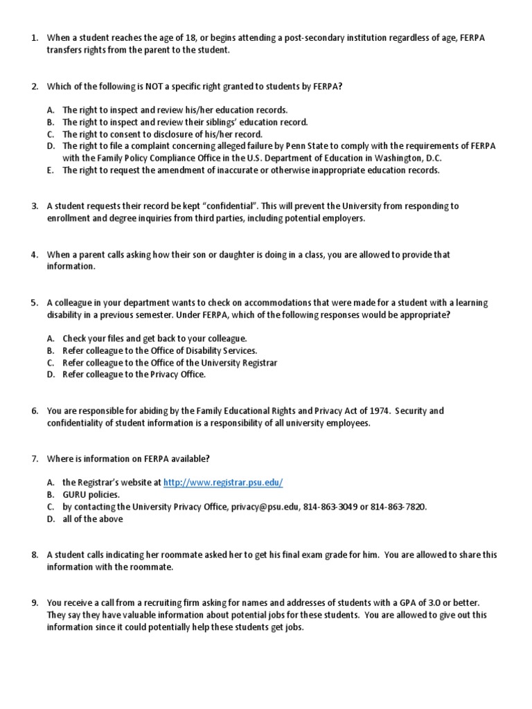 Ferpa Final Exam Answer Key Ferpa Final Exam Answer Key True False Section 1 T 2 T 3 F 4 T 5 T 6 T 7 T 8 F 9 T 10 T 11 F 12 T 13 F 14 Course Hero